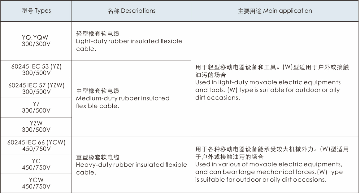 5、YQW、YZW、60245lEC57、YCW、60245lEC66電纜可在受礦物油和燃料油污染場合使用;
